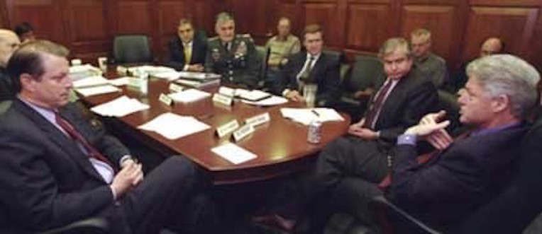الرئيس الأمريكي بيل كلينتون و آل جور مع قيادات السي آي آيه، من اليسار إلى اليمين و هم جورج تينيت و هنري شيلتون و ويليام كوهين و ساندي بيرجر