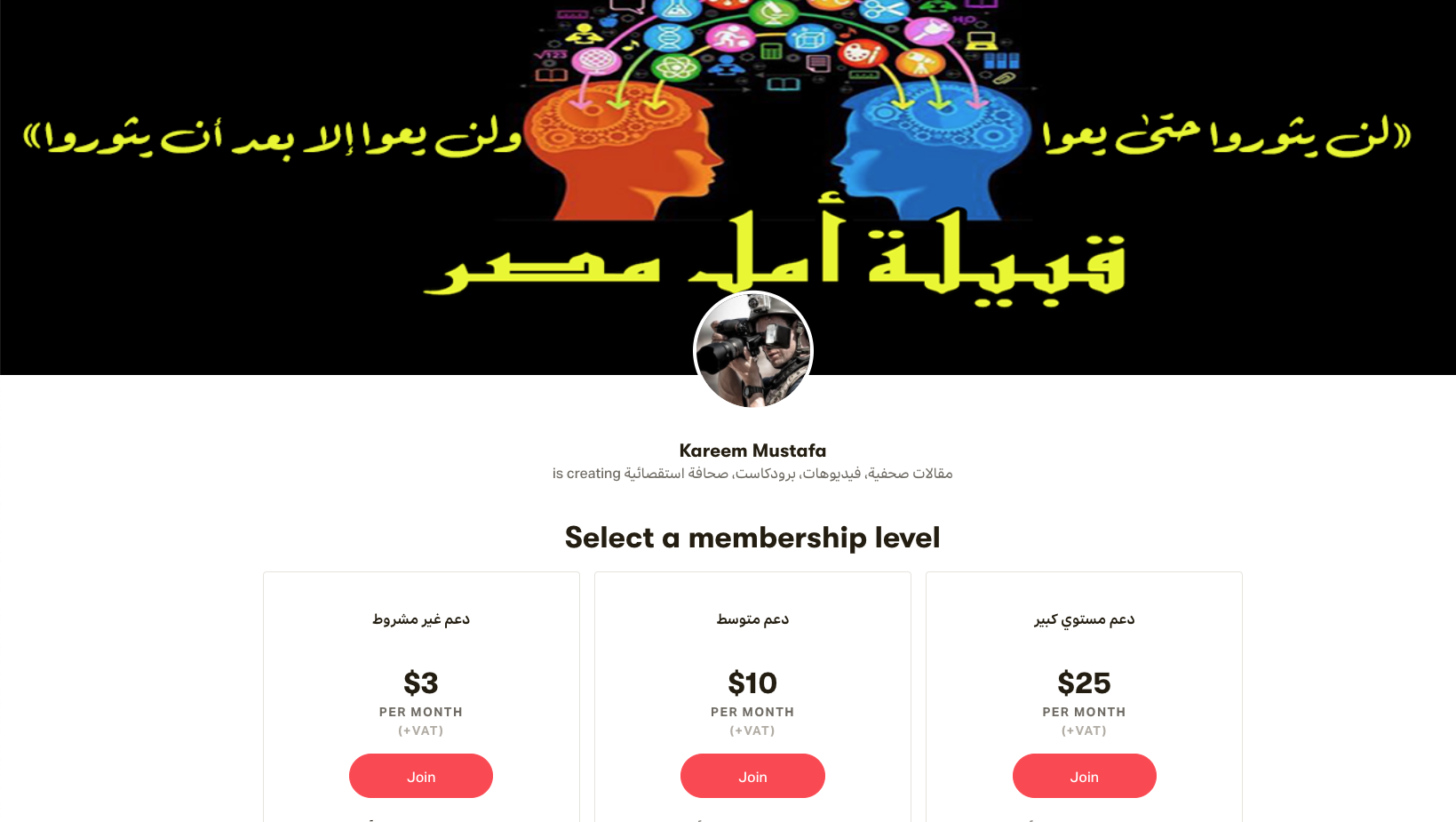 أهلاً بيك في حسابي علي باترون و شكراً لك علي التفكير في محاولة دعم المحتوي الذي اقدمه ، أنا كريم مصطفي ، صحفي استقصائي ، احاول ان اقدم للشعوب العربية في العموم و الشعب المصري في الخصوص محتوي بنقل الحقائق المجردة بعيداً عن المعوقات والقيود التي تضعها أنظمتنا العربية علي المؤسسات الاعلامية. و لقد أنشأت هذا الحساب من أجل تلقي الدعم الذي استطيع من خلاله الاستمرار في تقديم المحتوي و تطويره ........اقرأ المزيد